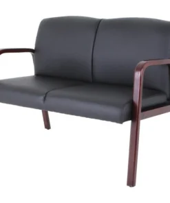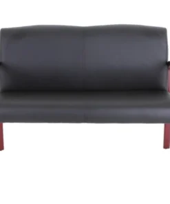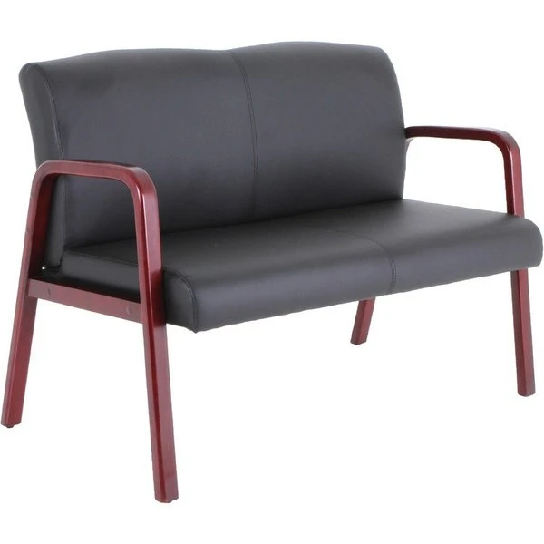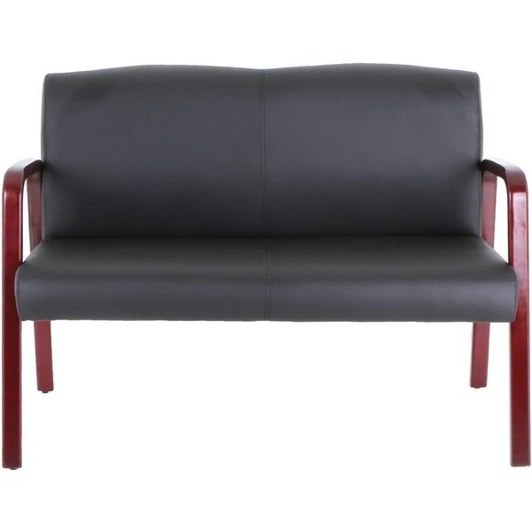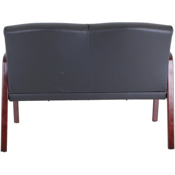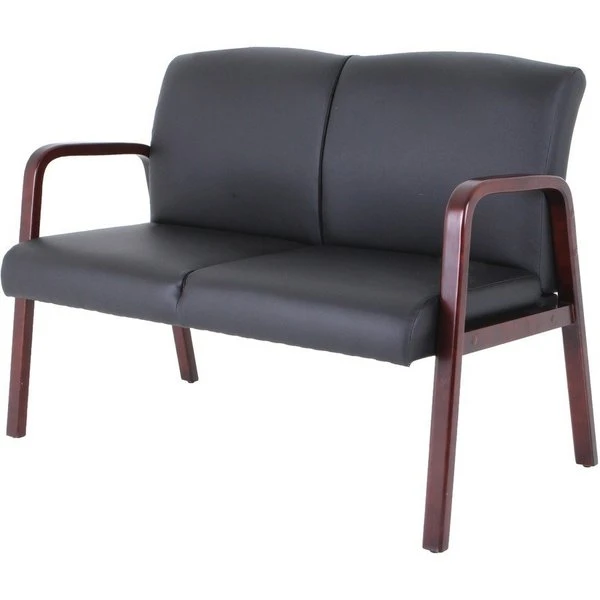 Love seat offers ideal guest seating with thick cushions, a wood frame and black bonded leather upholstery. Solid wood frame features front and back crossbars under seat for extra durability and strength. Four-leg, nonskid base is equipped with adjustable leg sliders for leg leveling. Chair also features fixed armrests to add to your comfort. Weight capacity is 275 lb.