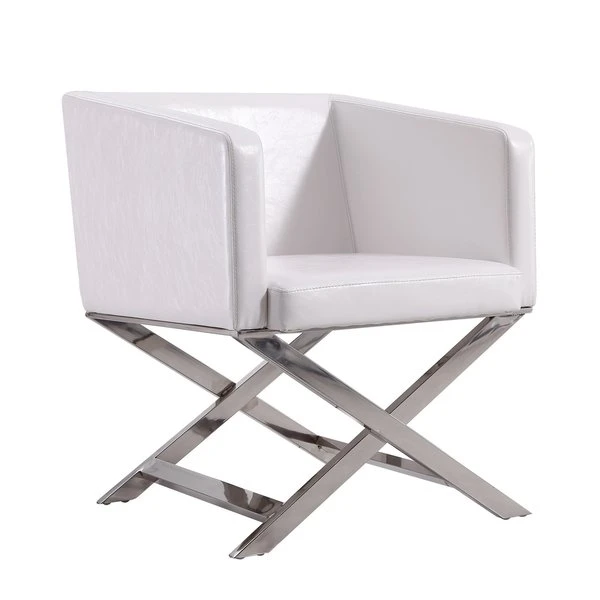 Take 5 in style. The iconic director's chair silhouette is reimagined in this confident contemporary accent chair. Classic folding legs are replaced with welded chrome-finished metal, while the casual low-back seat takes on tight tailoring and structured lines, transforming it into something decidedly sophisticated. Deep cushioning promises comfort with the inviting, slightly textured supple Faux Leather. Its generous seat and angled armrests give you plenty of room to lounge with a martini and great conversation.