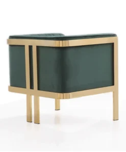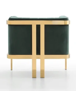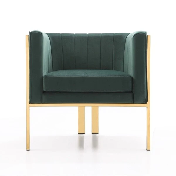 Lounge in 1920s luxury. This sophisticated accent chair is a modern, assertive take on the classic Art Deco style. An open architectural frame in polished brass wraps around the plush velvet seat, creating an inviting combination of simplicity and luxury. The seat’s backrest is accented with vertical stitching to complement it's geometric frame. The symmetrical, streamlined look will add an evocative touch of distinguished ‘20s glamour to any space.