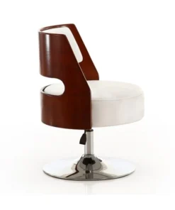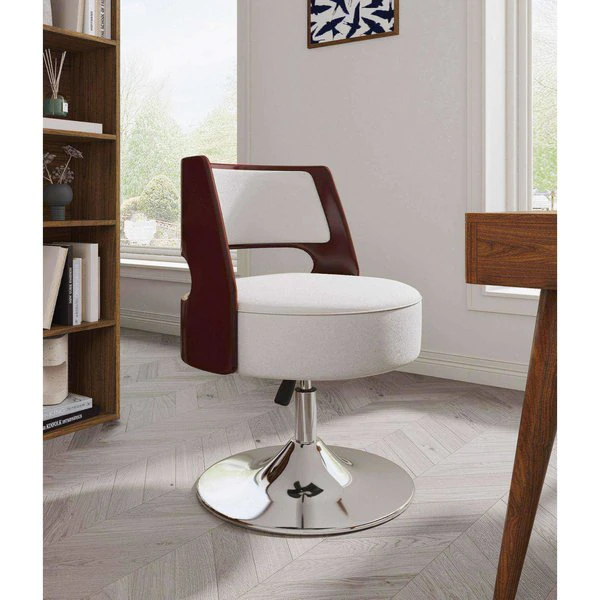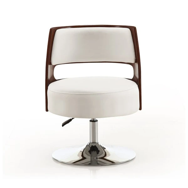 Design comes full circle. Ultra-versatile and incredibly stylish, this chic swivel chair will instantly dress up any space in your home. Well padded and upholstered in snowy white Faux Leather, its round seat is encircled by a curved shell-style back boasting a rich wood grain. With its easily adjustable height and 360 degree swivel capability, its refined armless design provides superior mobility, beautifully functional for home offices, living spaces, or dining areas.