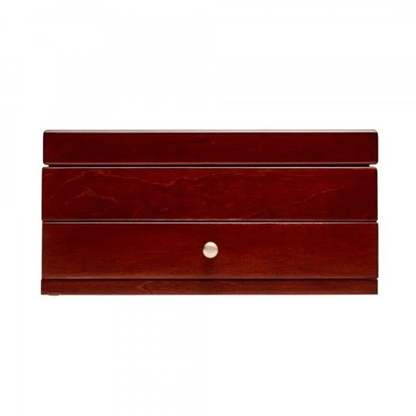 The beauty of its walnut wood grain finish and graceful Florentine style inlay motif give the Mele & Co. Brynn jewelry box a tasteful elegance. Featuring ring rolls. two open area sections and a drawer. its compact footprint offers more storage than meets the eye. The soft sueded ivory lining and silver tone drawer pull lend further refinement and make this jewelry chest a superb storage solution. FeaturesBrynn Wooden Jewelry Box with Florentine Marquetry Motif in Walnut FinishFlorentine style inlay motif on exterior lidLift lid with full interior mirrorTop compartment features two sections Plus ring rollsDrawer offers open area storageHand lined in ivory sueded fabricSilver tone drawer pullSpecificationsMaterial: Walnut FinishDimension: 8 1/4" x 5" x 4"