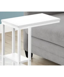 Straight lines and clean angles give this C-shaped accent table an elegantly modern look. The rectangular tabletop in a white finish is supported by a white metal frame with a secondary shelf underneath the table for convenient placement of smaller items. Slide this versatile end table under a sofa or chair to place snacks or mobile devices or use as a side table next to a bed.