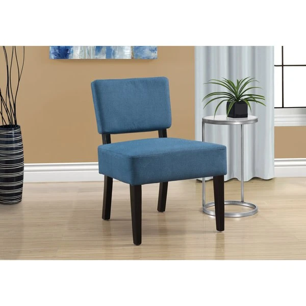 Combining contemporary lines and retro style, this versatile accent chair will bring sophistication to any room. It features sturdy, solid wood legs and exposed backrest supports in a black finish that provide an interesting visual contrast next to the soft, blue fabric. With a deep, extra-wide seat and gently curved backrest that offer maximum comfort, this upholstered armless chair makes a great guest chair or slipper chair in a living room or bedroom.. Upholstered armless accent chair in a blue fabric. Cushioned backrest and deep, wide seat with extra padding for comfort and support. Squared solid wood legs and backrest supports in a black finish provide stability. Assembly required: All parts are located underneath the seat cushion; illustrated instructions are provided for convenience (additional tools may be needed). Product dimensions: 22.75 inches L x 27.5 inches W x 31.5 inches H