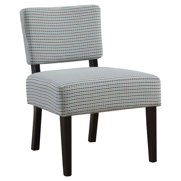 Combining contemporary lines and retro style, this versatile accent chair will bring sophistication to any room. It features sturdy, solid wood legs and exposed backrest supports in a black finish that provide an interesting visual contrast next to the soft fabric with a light blue and grey abstract dot pattern. With a deep, extra-wide seat and gently curved backrest that offer maximum comfort, this upholstered armless chair makes a great guest chair or slipper chair in a living room or bedroom.. Upholstered armless accent chair in a light blue and grey abstract dot fabric. Cushioned backrest and deep, wide seat with extra padding for comfort and support. Squared solid wood legs and backrest supports in a black finish provide stability. Assembly required: All parts are located underneath the seat cushion; illustrated instructions are provided for convenience (additional tools may be needed). Product dimensions: 22.75 inches L x 27.5 inches W x 31.5 inches H
