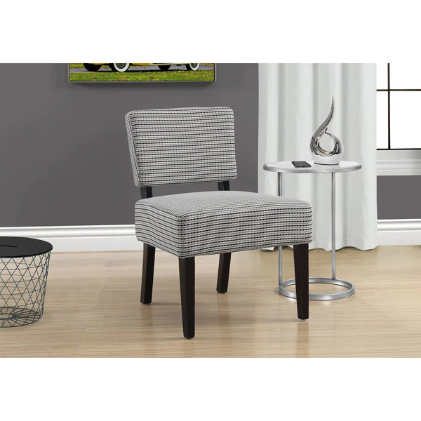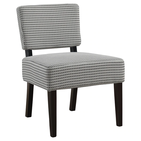 Combining contemporary lines and retro style, this versatile accent chair will bring sophistication to any room. It features sturdy, solid wood legs and exposed backrest supports in a black finish that provide an interesting visual contrast next to the soft fabric with a light grey and black abstract dot pattern. With a deep, extra-wide seat and gently curved backrest that offer maximum comfort, this upholstered armless chair makes a great guest chair or slipper chair in a living room or bedroom.. Upholstered armless accent chair in a light grey and black abstract dot fabric. Cushioned backrest and deep, wide seat with extra padding for comfort and support. Squared solid wood legs and backrest supports in a black finish provide stability. Assembly required: All parts are located underneath the seat cushion; illustrated instructions are provided for convenience (additional tools may be needed). Product dimensions: 22.75 inches L x 27.5 inches W x 31.5 inches H
