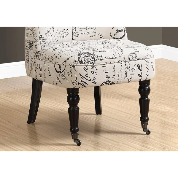 Bring some nostalgia and charm to your home with this elegant traditional style accent chair. It features a curved, tufted and padded scroll back design for comfort with a wide cushioned seat. The front black solid wood turn-post legs with wheels, provides easy mobility and add to the classic design. This armless slipper chair is further complimented with a beautiful vintage off-white and black French script printed linen blend fabric for a fresh update. Imagine how this lovely accent chair will give that extra special boost to your living room, bedroom, den, or entry way décor.