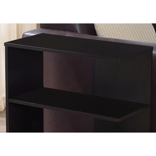 This simple rectangular side table with open storage shelving in a contemporary design brings style and function to any room. It starts with a smooth laminated espresso finish on all sides on a sturdy elevated base. The spacious tabletop can hold a small lamp, place your drink or set down your tablet or book. The two open shelves with a partial back panel are perfect to store books, magazines, or gaming consoles. So versatile, this accent table can also be placed in a bedroom as a nightstand as well as a side or end table in your living room or family room. Assembly is required.. Plenty of storage space with 2 large open shelves. Elevated base for height and stability. Compact contemporary design ideal for small spaces. Finished in an elegant laminated espresso on all sides.