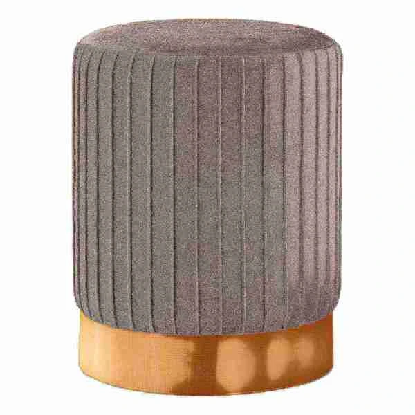 This exceptional ottoman commands attention with its unique cylindrical shape and distinctive details. Upholstered in a grey velvet fabric with a luxurious feel, the tall sides are pleated for visual and textural appeal while the padded seat is smooth to offer superior comfort. A sturdy metal base finished in lustrous gold completes the modern glam look. As versatile as it is chic, this round ottoman is great in a living room or bedroom as a foot stool to rest your feet and a makeshift table to place a book or mobile device, or as a pouf where and when you need an extra seat.