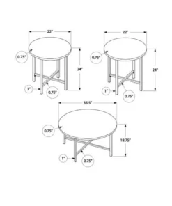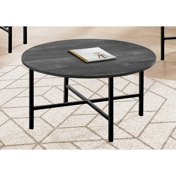 Refresh your living room with this stylish and contemporary 3 piece round table set that will add polish to your space. The clean lines of this set include a coffee table with a spacious black reclaimed wood look surface to showcase an artful arrangement, place some books or magazines, or to set down a tray of snacks when entertaining. The matching end tables can hold a lamp with space to put down your drink. The tables are supported with a sturdy cross metal base in a solid black finish for a nice, simple overall design. This table set fits perfectly in a small living room, family room, or office area without crowding a space or sacrificing style. Assembly is required.. Contemporary style 3 piece set that includes a round coffee table with two matching end tables. Warm and spacious black reclaimed wood look laminate tops with a simple, black cross metal base for sturdy support. An ideal size coffee table set for a small living room, family room, or office area with its clean line design and chic style. Product dimensions: 35.5 Inch L x 35.5 Inch W x 18.75 Inch H; 22 Inch L x 22 Inch W x 24 Inch H.