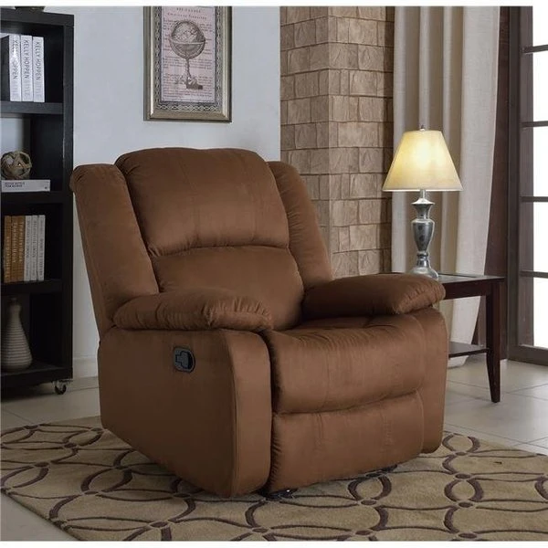 This recliner chair features a strong wood frame with soft foam and then enveloped in durable microfiber upholstery. Overstuffed padding for comfort. Choose from an array of colors that will best suit your personality or room. This large scale recliner also comes with full extension. high quality reclining mechanism. that is strong enough to withstand the rigors of daily use. FeaturesSamantha Microfiber ReclinerSpecificationsSize: 34 W x 37 D x 41" HWeight: 64 lbs