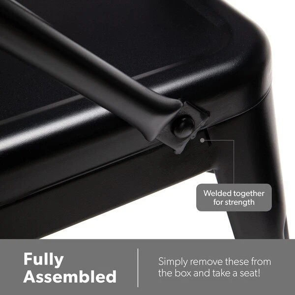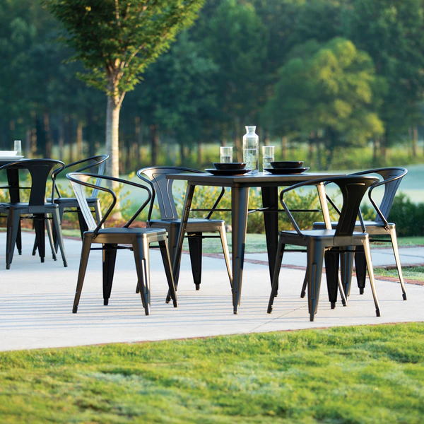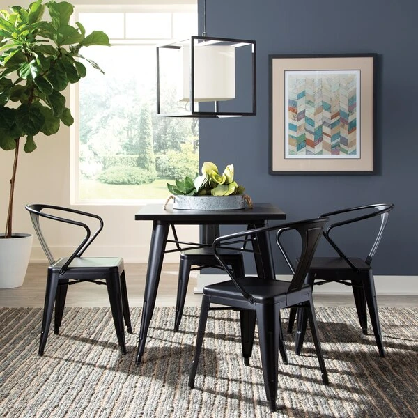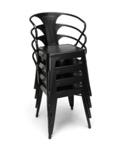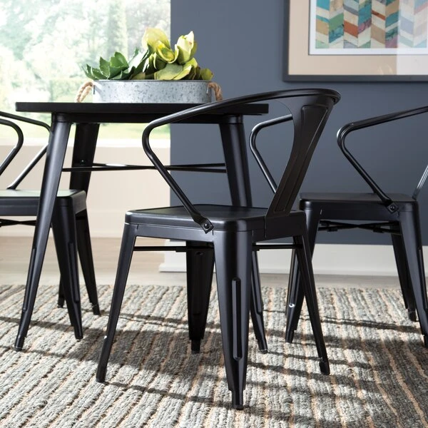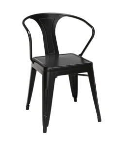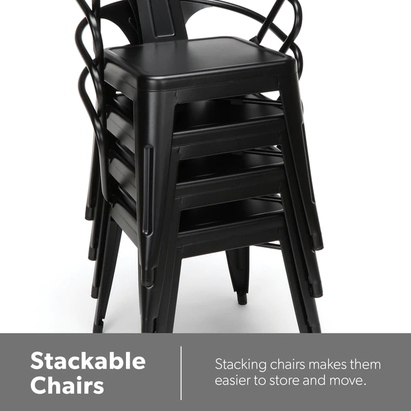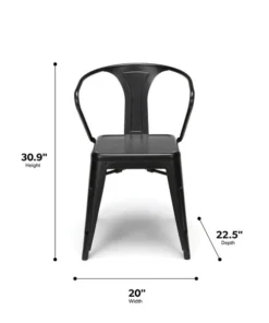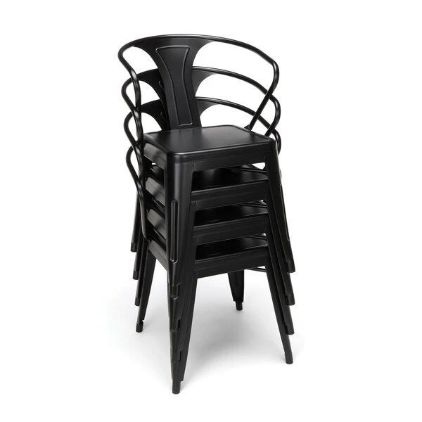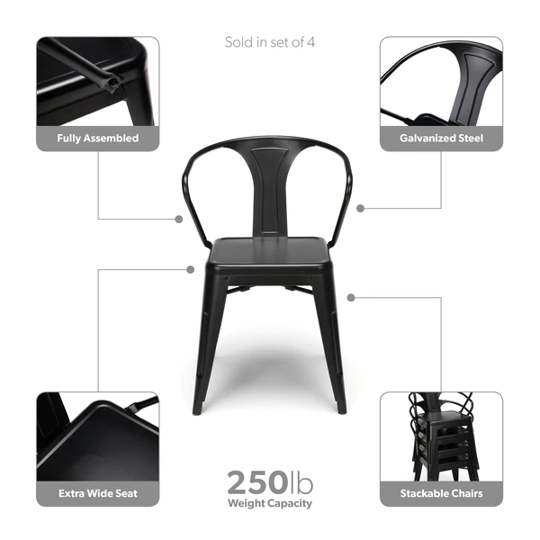 The 161 Collection blends mid century modern and industrial modern styles with current design trends to create timeless pieces that will seamlessly complement any decor. The OFM 161 Collection Industrial Modern 18" Mid Back Metal Dining Chairs with Arms, 4 Pack, are manufactured with galvanized steel for indoor and outdoor use. These stacking metal chairs come fully assembled and are welded together for added strength. The use of anti-UV powder to prevent heat retention make these dining chairs a great solution for outdoor spaces like cafes, bistros, pubs, or your own backyard. The mid back arm chairs feature extra wide seats, an x-brace beneath the seat that provides additional support and stability, measure 22.5" D x 20.0" W x 30.9" H, and hold at least 250 lb of weight. The metal surface makes cleaning easy and the plastic non-marring protective floor glides help prevent sliding and scratching. These chairs have been tested to light commercial-grade standards. With our 5 Year Limited Warranty, these patio chairs bring substance and style to any space.