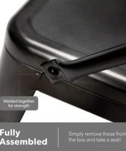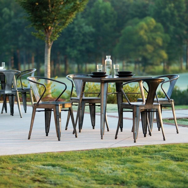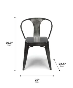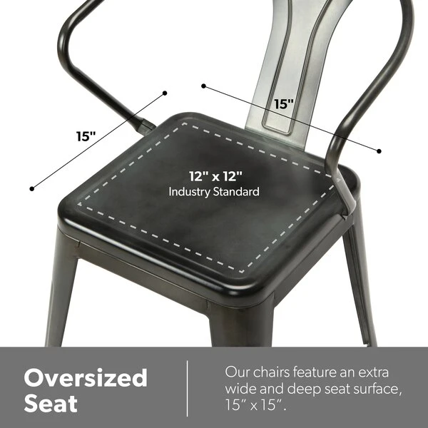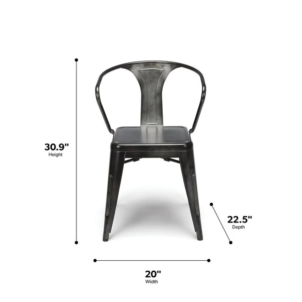 The 161 Collection blends mid century modern and industrial modern styles with current design trends to create timeless pieces that will seamlessly complement any decor. The OFM 161 Collection Industrial Modern 18" Mid Back Metal Dining Chairs with Arms, 4 Pack, are manufactured with galvanized steel for indoor and outdoor use. These stacking metal chairs come fully assembled and are welded together for added strength. The use of anti-UV powder to prevent heat retention make these dining chairs a great solution for outdoor spaces like cafes, bistros, pubs, or your own backyard. The mid back arm chairs feature extra wide seats, an x-brace beneath the seat that provides additional support and stability, measure 22.5" D x 20.0" W x 30.9" H, and hold at least 250 lb of weight. The metal surface makes cleaning easy and the plastic non-marring protective floor glides help prevent sliding and scratching. These chairs have been tested to light commercial-grade standards. With our 5 Year Limited Warranty, these patio chairs bring substance and style to any space.