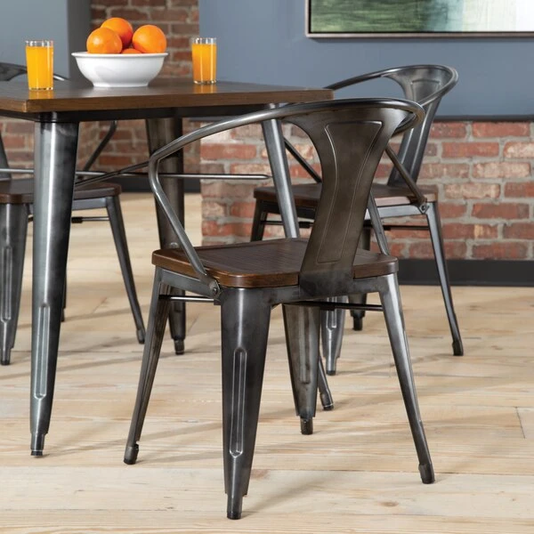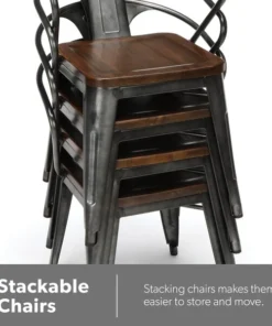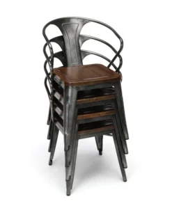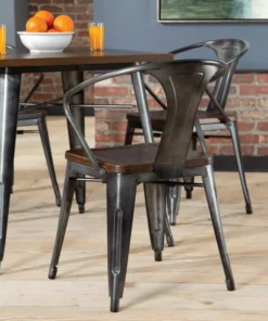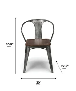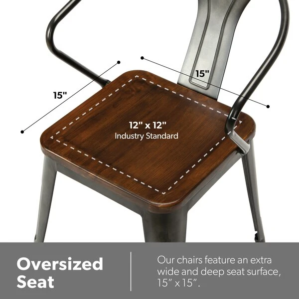 The 161 Collection blends mid century modern and industrial modern styles with current design trends to create timeless pieces that will seamlessly complement any decor. The OFM 161 Collection Industrial Modern 18" Mid Back Metal Dining Chairs with Arms and Solid Ash Wood Seats, 4 Pack, feature galvanized steel chair frames with solid ash wood seats, marrying the industrial with the modern. These stacking metal chairs come fully assembled and are welded together for added strength. The arm chairs feature an anti-UV powder to prevent heat retention, making these dining chairs a great solution for covered outdoor spaces like restaurants, cafes, bistros, pubs, or your own backyard. The mid back arm chairs feature extra wide seats, an x-brace beneath the seat that provides additional support and stability, measure 22.5" D x 20.0" W x 30.9" H, and hold at least 250 lb of weight. The metal and wood surfaces make cleaning easy and the plastic non-marring protective floor glides help prevent sliding and scratching. These chairs have been tested to light commercial-grade standards. With our 5 Year Limited Warranty, these dining chairs bring substance and style to any space.