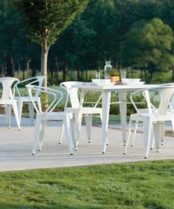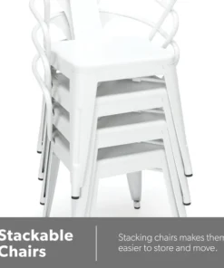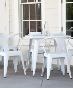 The 161 Collection blends mid century modern and industrial modern styles with current design trends to create timeless pieces that will seamlessly complement any decor. The OFM 161 Collection Industrial Modern 18" Mid Back Metal Dining Chairs with Arms, 4 Pack, are manufactured with galvanized steel for indoor and outdoor use. These stacking metal chairs come fully assembled and are welded together for added strength. The use of anti-UV powder to prevent heat retention make these dining chairs a great solution for outdoor spaces like cafes, bistros, pubs, or your own backyard. The mid back arm chairs feature extra wide seats, an x-brace beneath the seat that provides additional support and stability, measure 22.5" D x 20.0" W x 30.9" H, and hold at least 250 lb of weight. The metal surface makes cleaning easy and the plastic non-marring protective floor glides help prevent sliding and scratching. These chairs have been tested to light commercial-grade standards. With our 5 Year Limited Warranty, these patio chairs bring substance and style to any space.