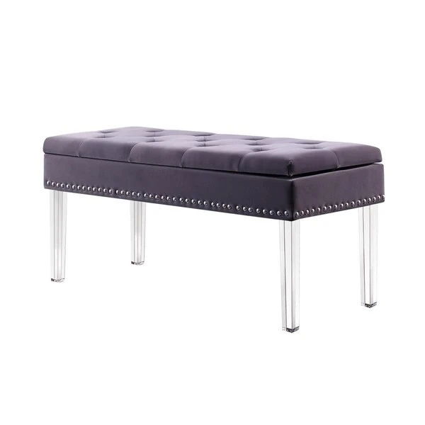 <p>Navy Blue Tufted Mid-Century Storage Bench Nailhead Trim with Acrylic Clear Legs </p><p>Navy Blue Mid-Century Modern Tufted Upholstered Bench brings you a design with all of the style and versatility you could want. This bench includes clear acrylic square tapered legs that is eye-catching and sleek. This bench is perfect for an entryway, bedroom, living room adding a stylish and functional modern accent. The clear acrylic legs offer a dramatic look to the simple shape. Has ample storage organization to place your blankets, pillows, sheets and such. Standing stylishly on gracefully clear acrylic tapered legs, this chic piece features plush seating with tufted details for lasting comfort. </p><strong>Features</strong><ul><li>Silver Round Nailhead trim the edges on the bottom of the bench</li><li>Dual Lift Hinges for durabilty and sturdiness</li><li>Cloth fabric is made of Linen/Polyester blend</li><li>Upholstery is made of 97% Polyurethane Foam, Upholstery fill 3% Polyester Batting foam</li><li>Use a damp cloth for cleaning</li></ul><strong>Specifications</strong><ul><li><strong>Color:</strong> Navy Blue</li><li><strong>Size:</strong> 18 in.</li><li><strong>Storage Dimension:</strong> 39" L x 14.5" W x 4" H</li><li><strong>Unfinished Natural Tapered Legs Measure:</strong> 1.25" L x 1.25" W x 12" H</li><li><strong>Weight:</strong> 28 lbs</li></ul>