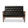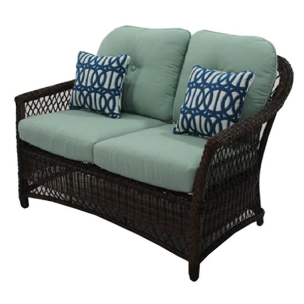 FeaturesAll weather woven wicker with powder coated steel frameDurable sunbrella 100% acrylic mist fabric is done in a subtle blueFabric is also resistant to stains and mildewEasily cleaned and is an added protection against uv raysIncludesIncludes two 14" x 14" decorative pillows done in an aztec printSpecificationsMaterial: 100% AcrylicCapacity: 500 lbsWarranty: 5 YearsDimension: 35.28" H x 31.22" W x 49.41" LWeight: 33.74 lbs