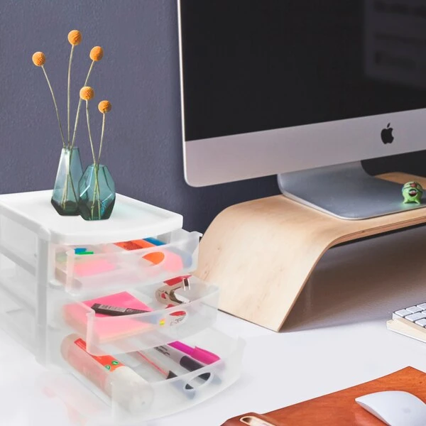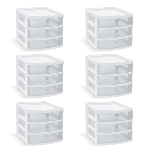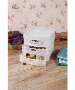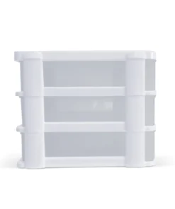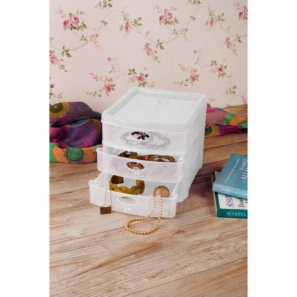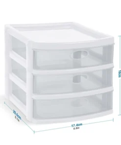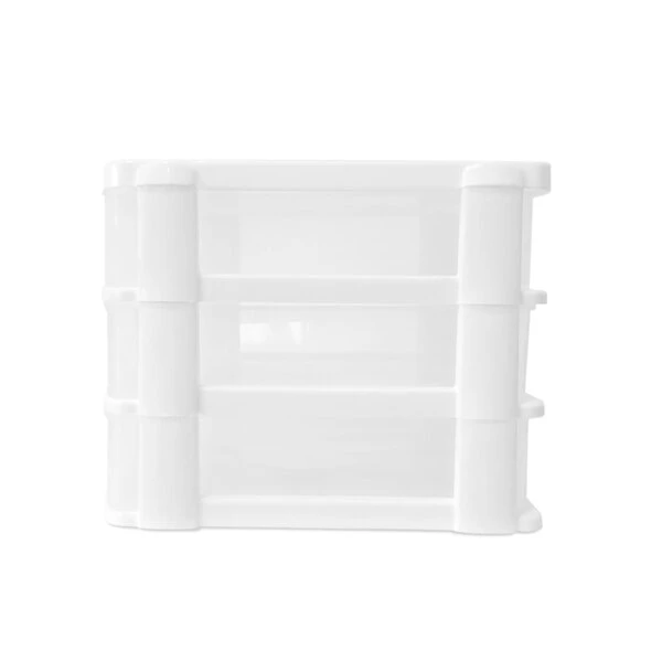 3-Drawer storage cabinet by MQ® is finished in Clear Polypropylene (PP) resin material with a white frame. This storage cabinet includes 3 drawers with a capacity xx liters (xx.x quarts) each and is adorned with brush steel simulated resin handles. This cabinet is sturdy and the drawers can be completely removed for easy cleaning.