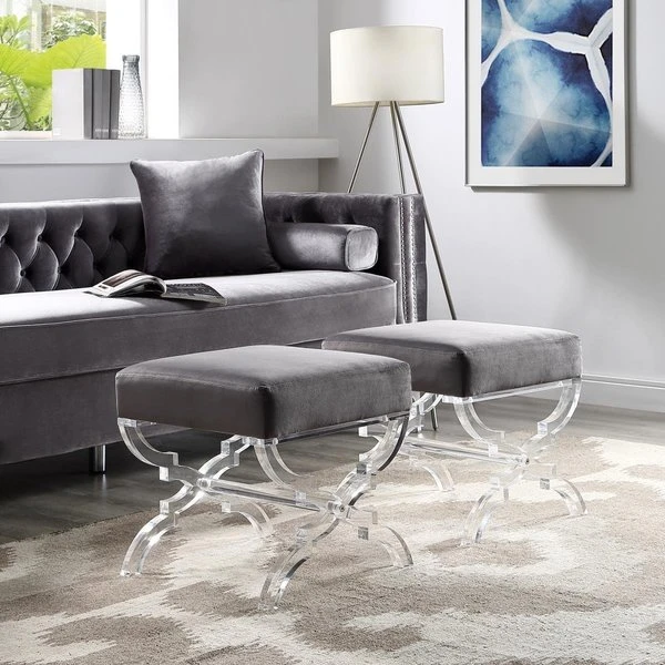 Our acrylic X-leg ottoman adds a gentle sophistication in the confines of your living room bedroom or entryway. Featuring a velvet upholstered high density foam cushioned seat and steady x-leg acrylic base this elegant accent piece provides both functionality and a focal point of color and style that seamlessly blend with your main furniture to create a dynamic and cozy interior space to come home to. About the Company: Inspired Home Co. provides modern casual on-trend occasional furniture ottomans benches fabric headboards and beds side tables dining chairs barstools accent chairs accent tables and sofas. Inspired Home is known for providing fashion forward designs quality home furnishings at affordable prices.
