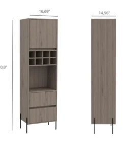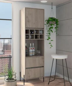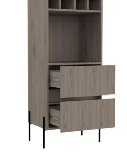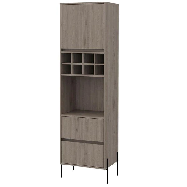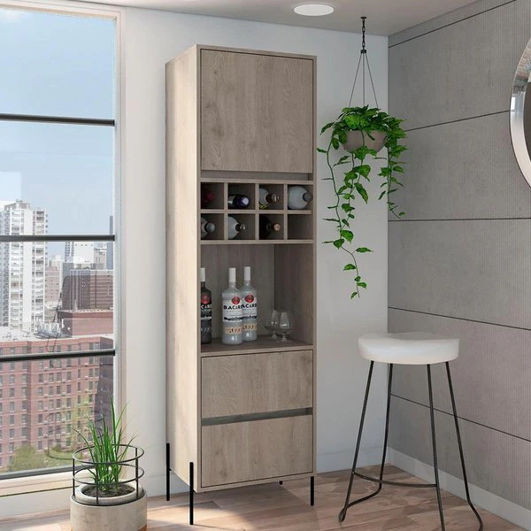Keep your party space clear and organized and have fun doing it. This towering bar cabinet features a modern design with natural elements for an elegant and durable addition to your interior space. A combination of pull-out drawers, exposed shelving, and bottle compartments offer a wide variety of storage solutions.