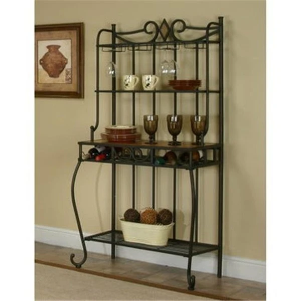 Add a beautiful solution to your storage. counter top and display needs with Sunset Trading's transitional Dart Bakers Rack. The shelves are sturdy enough for appliances. display cookbooks. canisters. plants. ice or wine buckets or any large item you need extra space for. The built in wine rack makes it easy for you to create your own entertainment area for parties or everyday living. Alternately. you can use this baker's rack to display family pictures and hold videos in the living room or display toiletries and rolled towels in the bathroom.Featuresolid wood with oak veneer top with genuine slate inlaysBuilt-in wine rack and stemware holder adds a touch of fun and lots of convenienceSturdy steel construction frame with elegant scrolled detail and floor protectorsPair with Sunset Trading Dart Dining Set CR-Y2091-68_(2)CR-Y2091-24-RTASteel Frame/Oak Veneer ShelfAssembly – Yes