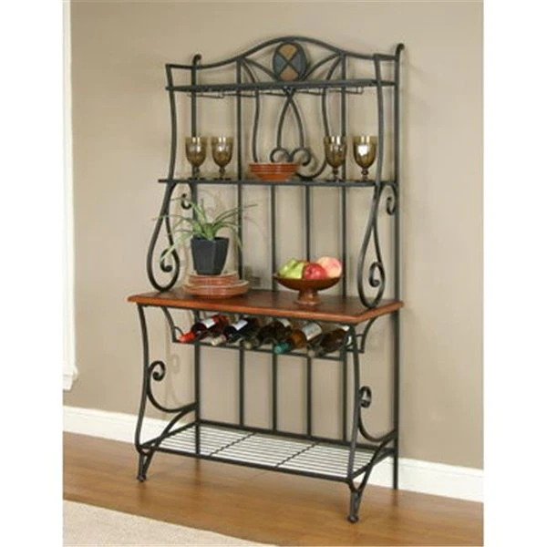 Add a beautiful solution to your storage. counter top and display needs with Sunset Trading's classic Vail Bakers Rack. The shelves are sturdy enough for appliances. display cookbooks. canisters. plants. ice or wine buckets or any large item you need extra space for. The built in wine rack makes it easy for you to create your own entertainment area for parties or everyday living. Alternately. you can use this baker's rack to display family pictures and hold videos in the living room or display toiletries and rolled towels in the bathroom.FeaturesSturdy steel construction frame with elegant scrolled detail and floor protectorsBuilt-in wine rack and stemware holder adds a touch of fun and lots of convenienceSturdy steel construction frame with elegant scrolled detail and floor protectorsPair with Sunset Trading Vail 5 Piece Counter Height Dining Set CR-W2597-64-5PCSteel Frame/Oak Veneer Shelf / SlateAssembly – Yes