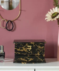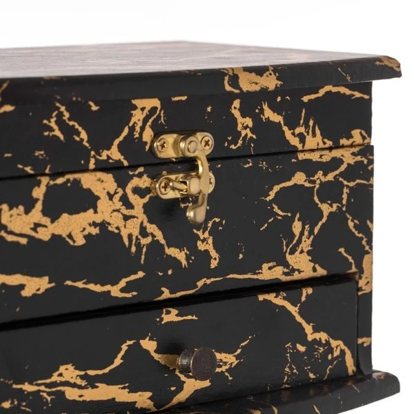 <p>A perfect jewelry chest to organize your assortments. Reveals a drawer on the bottom and a lifting top with a latch to keep your jewelry safe. Has a black lining to protect your valuables. It can also use as a decorative storage box with its modern black and gold marble design.</p><ul><li>SIZE: 8.25" W x 6" D x 5" H</li><li>FEATURES: A drawer and a lifting top with a latch to keep your jewelry safe</li><li>TREASURE CHEST: Kids can also use this type of box for their little treasures and toys</li><li>DESIGN: Modern black and gold marble design</li><li>INCLUDES: Has a black lining for protection</li></ul>